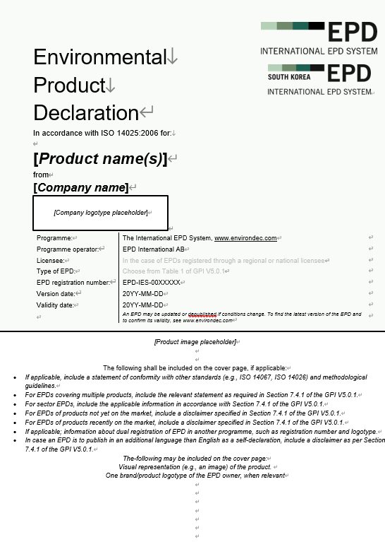 EPD 템플릿 - 기타 모든 제품 카테고리: 한국 전용 템플릿 ·EPD template - All other product categories (Version 2.0 of the default indicator list based on GPI 5) 다운로드